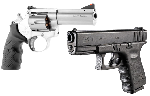 Pistolen en revolvers zijn onderverdeeld in Klein Kaliber Pistool/Revolver (KKP/KKR) en Groot Kaliber Pistool/Revolver (GKP/GKR). Het laatste is een verzamelnaam voor diverse soorten patronen, waaronder 9 millimeter (pistool) dat ook door de politie wordt gebruikt en de van film en tv bekende .357 Magnum en .38 (revolver).
